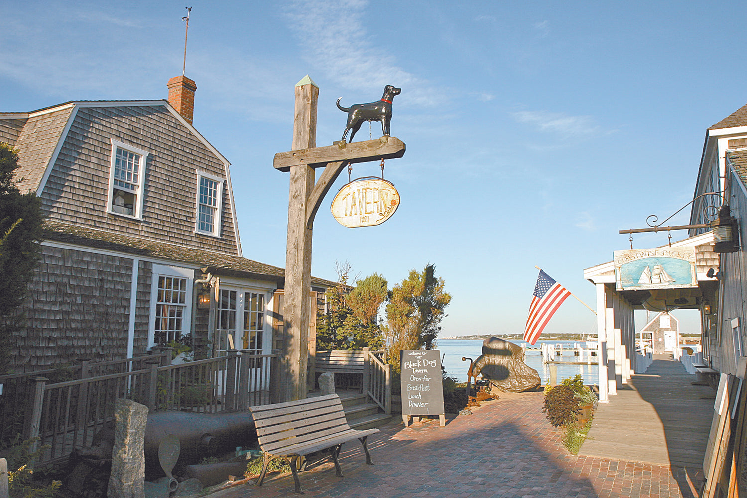 It all started with a stale donut on a desperately cold day in 1969. At that time, the Vineyard did not have a year-round restaurant, so Captain Robert Douglas’ repast that night was a bitter cup of coffee and a dry, packaged, store-bought donut. The Captain, unsatisfied by his “meal,” picked up a pencil and began sketching on a paper napkin. He drew a small gambrel-roofed building, which grew in stature and structure over the course of several more napkins. The end result was a restaurant situated on the beach, at the head of Vineyard Haven Harbor, a place where locals and visitors could meet and eat. The Captain’s excitement for his creation was contagious. The townsfolk helped build and shingle. Locals shared their recipes for pies, chowders, and soups. When the building was completed, the Captain named his restaurant in honor of his faithful canine companion, Black Dog. Not much has changed from those early days. The view of Vineyard Haven Harbor is still as lovely as ever, and the Tavern chefs continue to share their culinary creations with our customers. We serve breakfast, lunch, and dinner, including daily specials, year-round, and always craft our food with the finest ingredients.