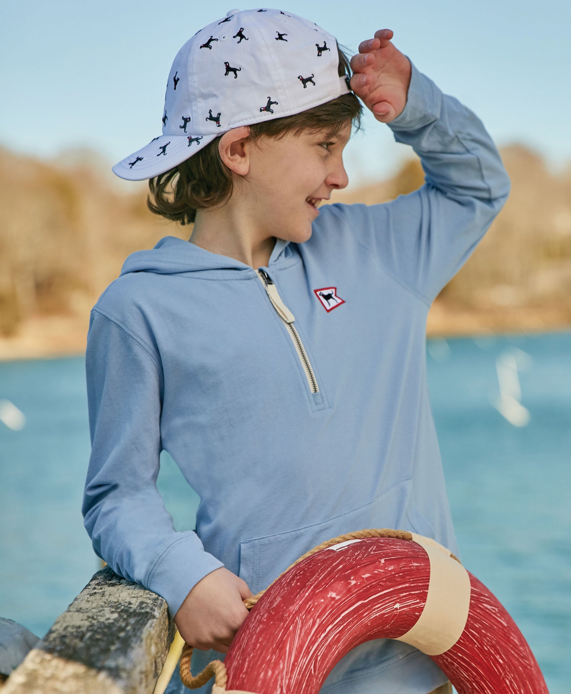 The Kids Quarter Zip Cadet Hoodie is a stylish and versatile option for your child's wardrobe. Made from high-quality ringspun combed cotton, this hooded tee is the perfect weight and can be easily layered over any shirt. Whether worn alone or paired with other items, it's perfect for a variety of occasions, such as beach trips or summer nights. The nautical graphic featuring our signature burgee logo adds a fun touch to this casual and comfortable piece.