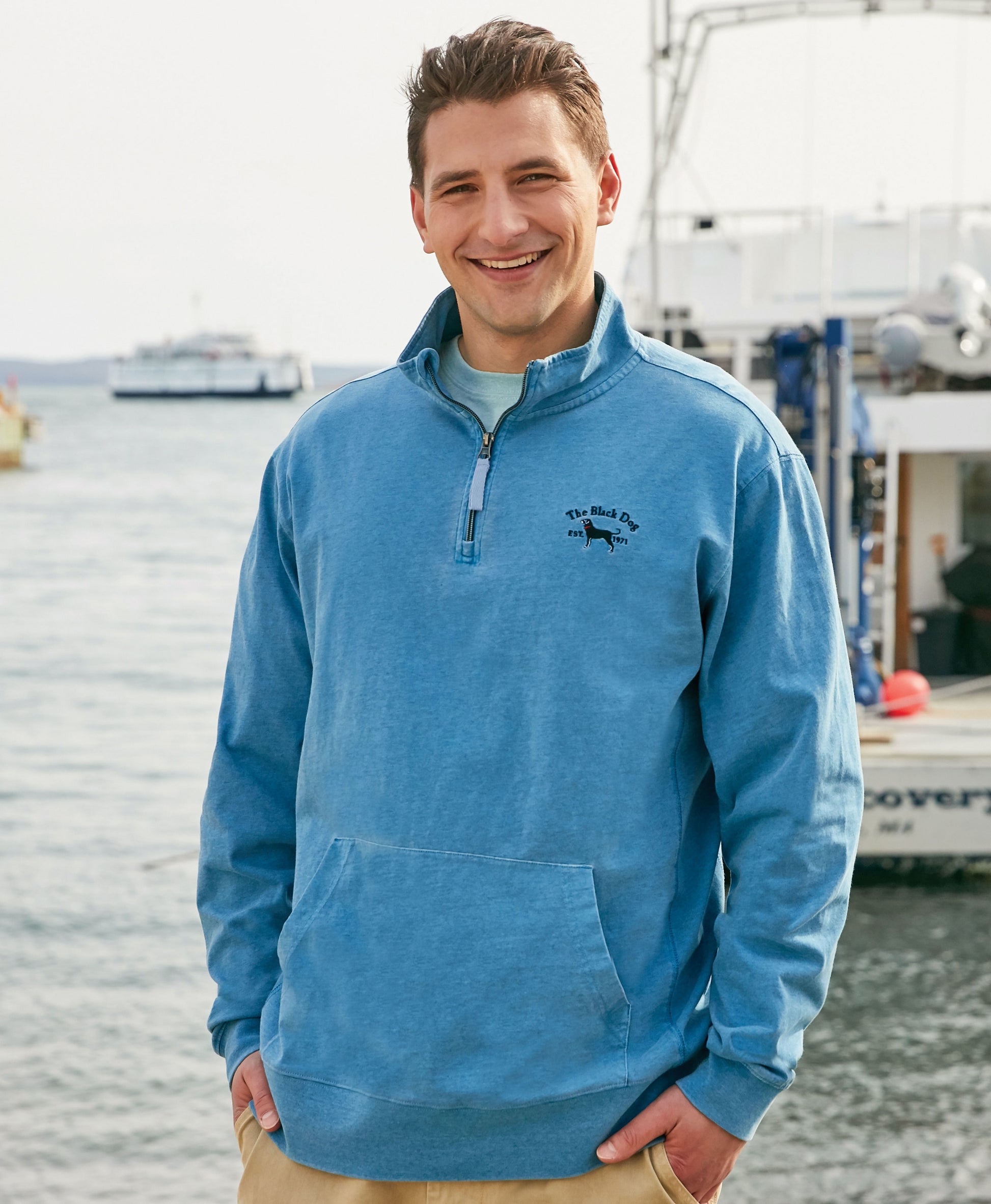This Men's Quarter Zip Cadet blends comfort with casual style, featuring our signature Cadet fabric made from 100% jersey cotton. Ideal for daily use, it comes with ribbed cuffs and a bottom band for a great fit. The Ships Hull version showcases our classic Black Dog embroidery on the left chest, while the Swell option displays a plain embroidered classic dog. With a mid-weight feel, it’s a reliable go-to for everyday wear.