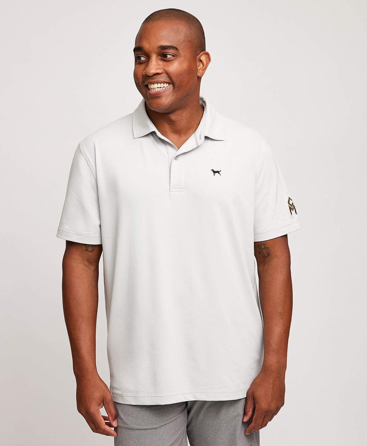 Introducing the Men's Charlie McAvoy Golf Polo, part of the exclusive Black Dog x Charlie McAvoy Collection. This technologically advanced polo is made with 91% Polyester and 9% Spandex, providing moisture-wicking, cooling, and flexible comfort. It features the iconic Black Dog logo on the front and Charlie's "CM" brand on the sleeve.