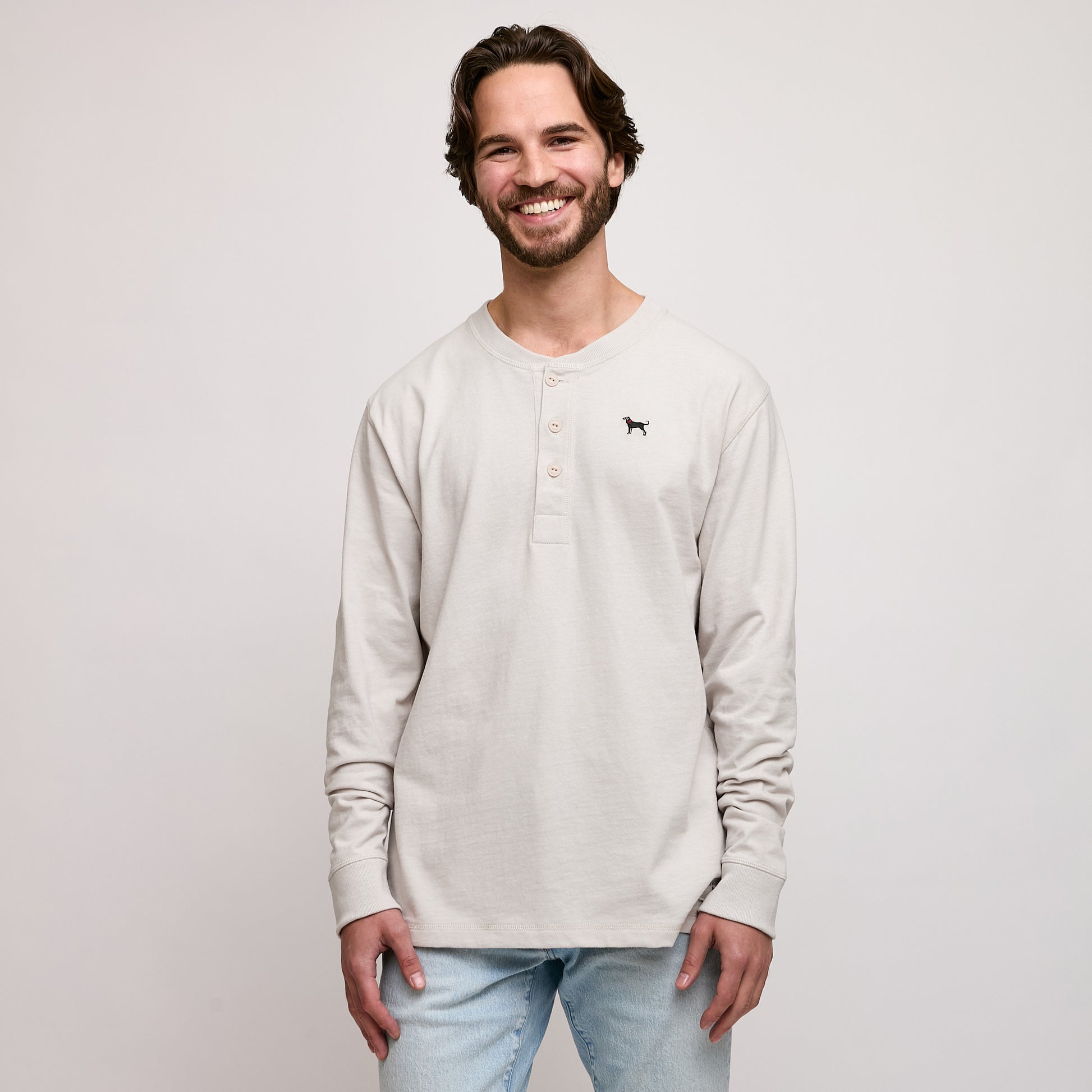 Crafted from 100% organic cotton, this henley features a classic 3-button design in a versatile twine shade. The mid-weight fabric pairs effortlessly with jeans or joggers, while the embroidered grey Black Dog logo on the chest and patch at the lower left hem add distinctive character. A timeless piece built to last. This longsleeve offers a relaxed, roomy fit. Prefer a more tailored silhouette? Size down for a closer cut that suits your style.